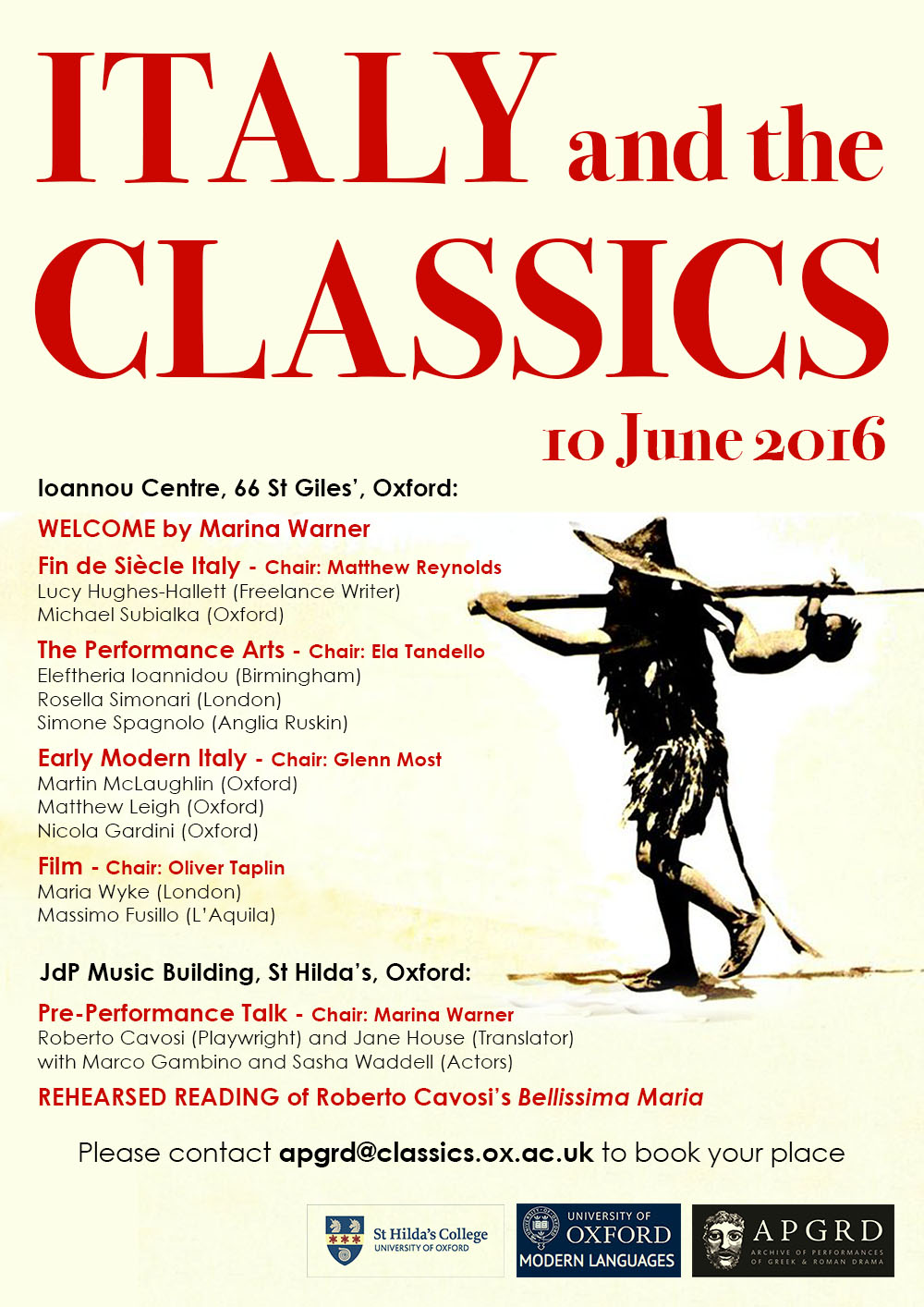 A joint one-day conference organised by the APGRD, together with support from Modern Languages, Oxford and The Society for Italian Studies. With Marina Warner, and featuring a rehearsed reading of Roberto Cavosi’s Bellissima Maria (after Phaedra/Hipploytus). There will be an accompanying exhibition in the atrium of the Ioannou Centre, curated by Claire Kenward (APGRD).