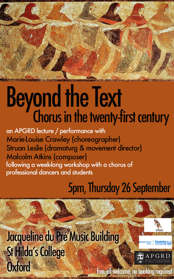 The lecture/performance is the culmination of a week-long workshop with a chorus of professional dancers and students and it is kindly supported by DANSOX, C-DaRE (University of Coventry) and the Oxford University Classical Drama Society (OUCDS).
